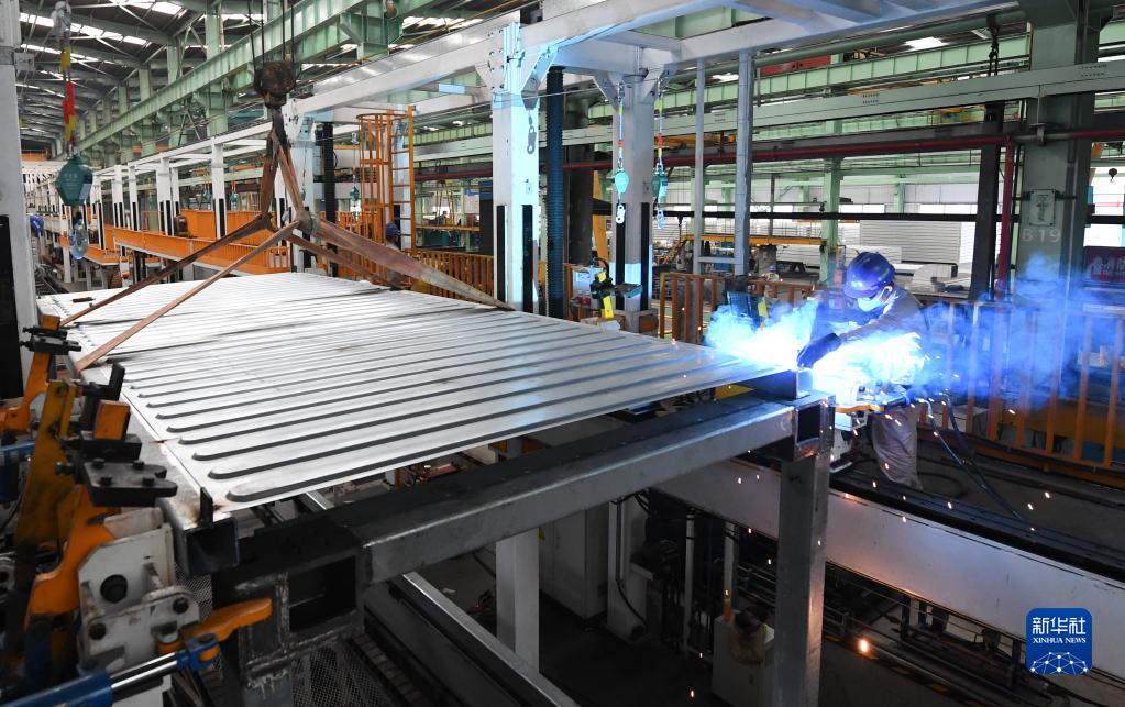工人在智能化鋼結構模塊化生產線的總裝線上進行焊接作業(2022年9月28日攝)。