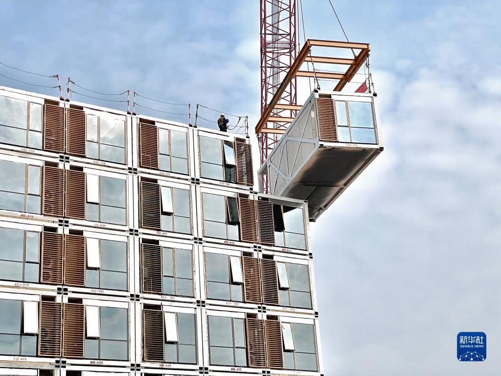 在深圳灣區會展國際酒店項目現場,工人吊裝鋼結構箱體(2021年10月20日攝)。