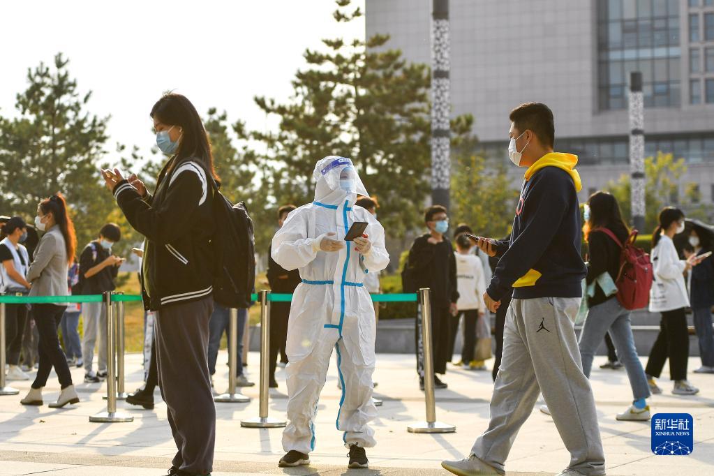 10月2日,在吉林省長春市一處便民核酸檢測點,工作人員為前來進行核酸檢測的市民掃碼登記。