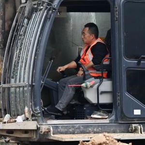 10月2日,中鐵上海工程局施工人員在位于陜西省西安市的西十高鐵浐河特大橋操作旋轉挖機(無人機照片)。