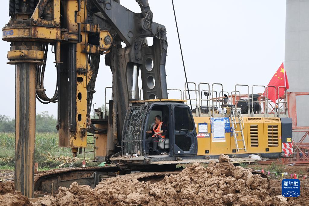10月2日,中鐵上海工程局施工人員在位于陜西省西安市的西十高鐵浐河特大橋操作旋轉挖機。