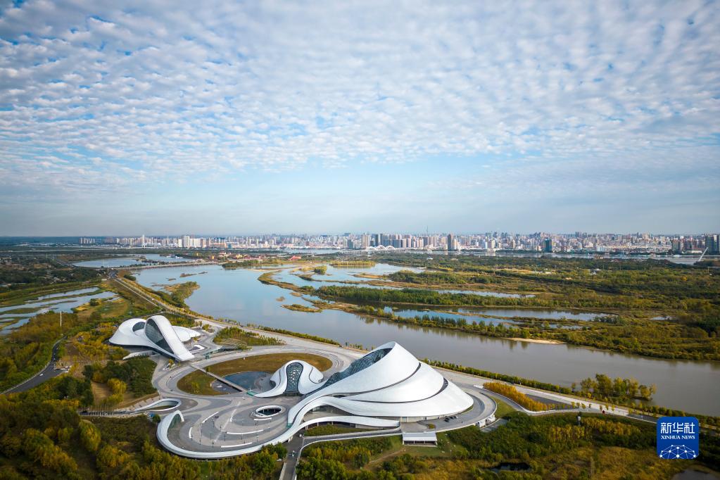 這是2022年9月26日拍攝的位于松花江畔的哈爾濱大劇院(無人機照片)。