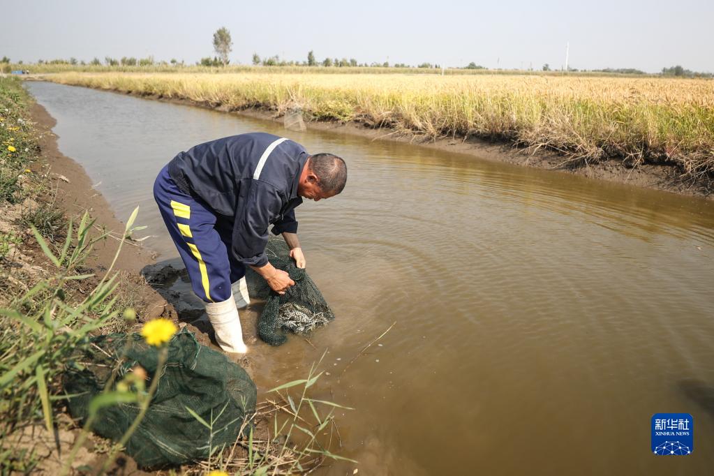 2022年9月28日,工作人員在遼寧省盤錦市大洼區(qū)三角洲“蟹稻+”綜合種養(yǎng)模式試驗基地的稻田收獲河蟹。