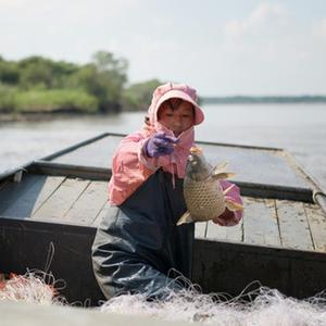 在黑龍江省同江市八岔赫哲族鄉八岔村二道江灘地,赫哲族村民叢秀松把剛打上來的魚扔進船艙(2020年7月22日攝)。