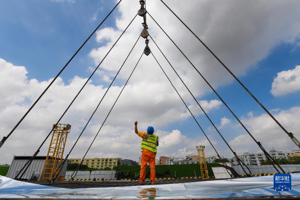 10月3日,中鐵十一局的工人在廣花城際鐵路白云城市中心站施工。