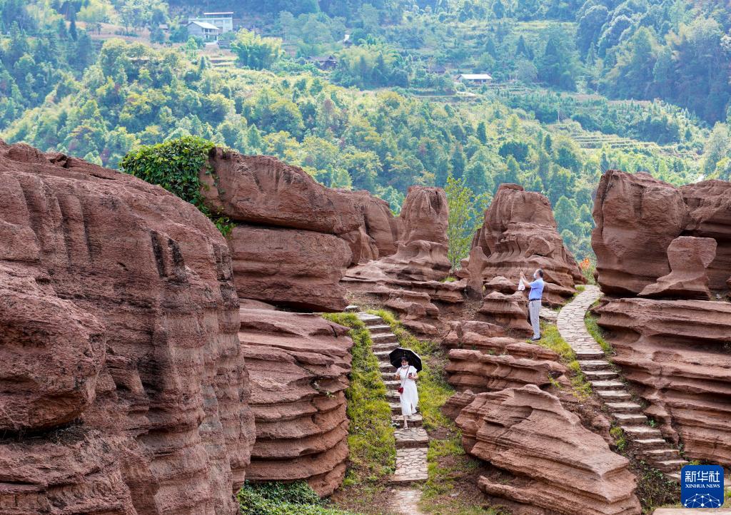 國慶期間,重慶市酉陽縣紅石林地質公園開園迎客,不少游客前來感受這里獨特的地質奇觀。