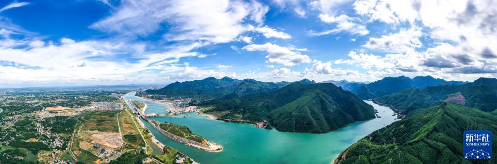 這是建設中的廣西大藤峽水利樞紐工程和周邊峽谷(2022年8月9日攝,無人機照片)。