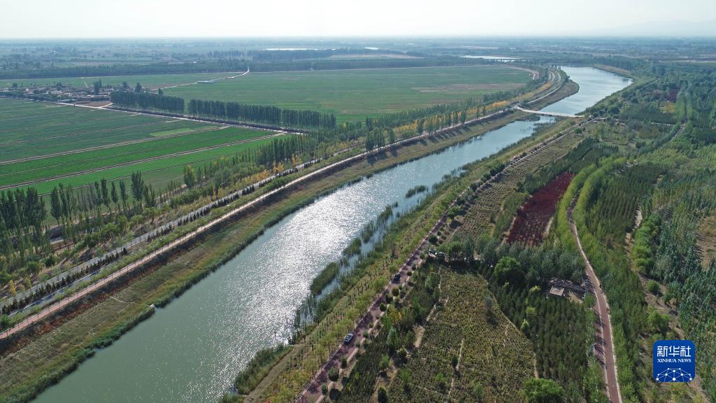 這是10月4日在寧夏銀川市永寧縣拍攝的典農河秋景(無人機照片)。