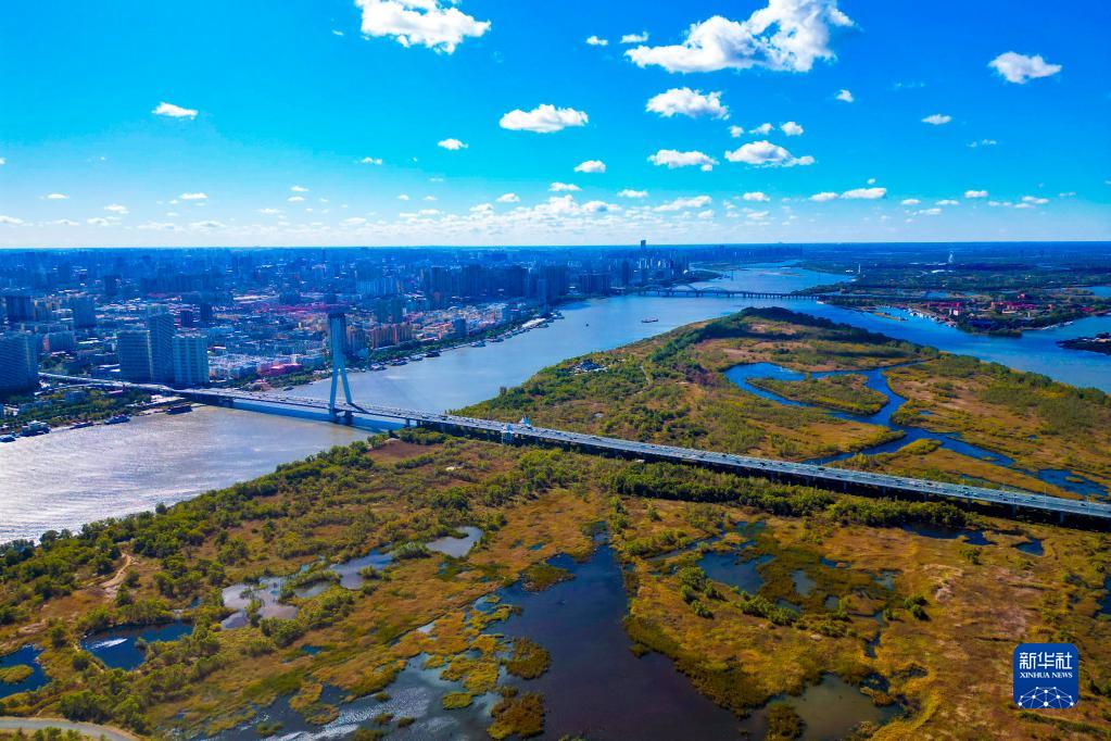 這是10月4日拍攝的哈爾濱市阿勒錦島國家級濕地公園景色(無人機照片)。