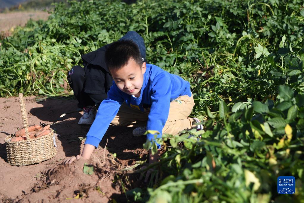 10月4日,小朋友在甘肅省蘭州市石佛溝一處露營地體驗采摘。
