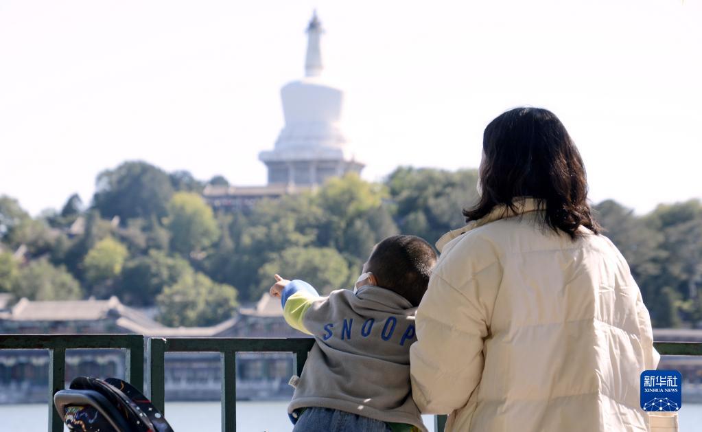 10月4日,市民帶著孩子在北京北海公園賞景。