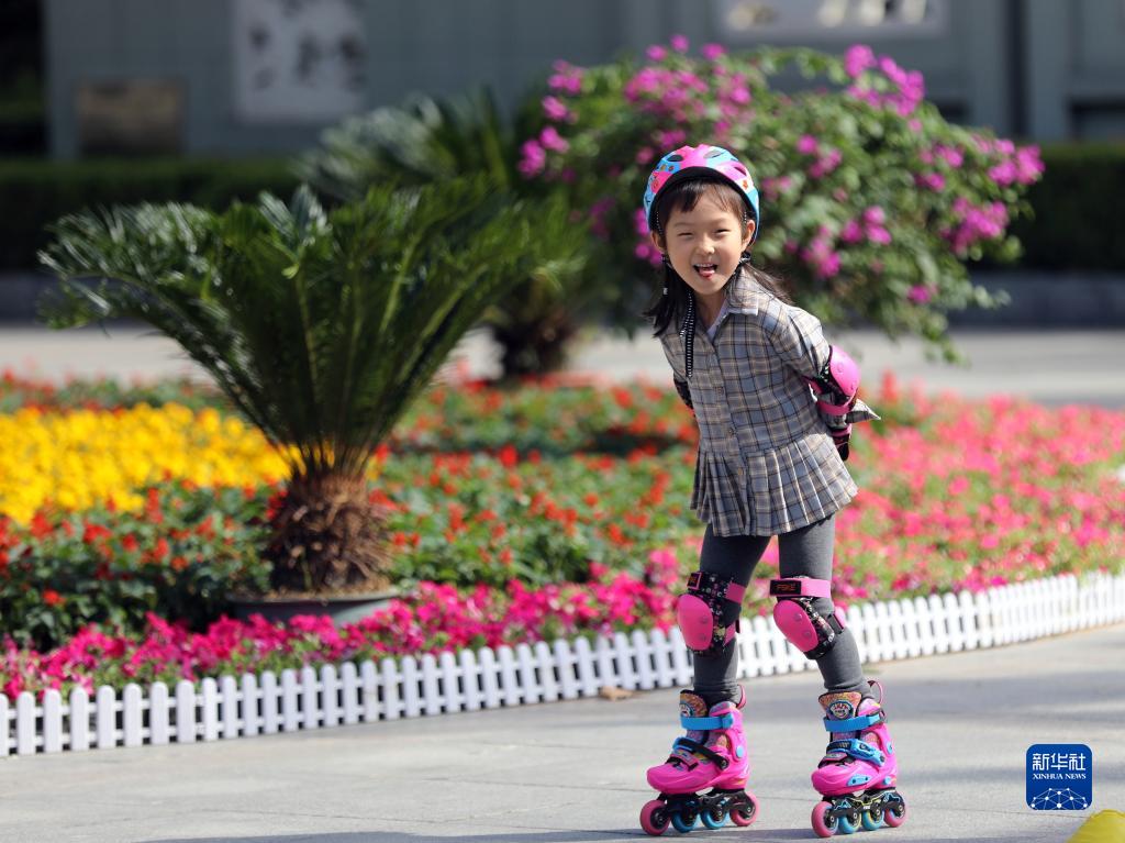 10月4日,小朋友在河北省石家莊市東環(huán)公園滑輪滑。