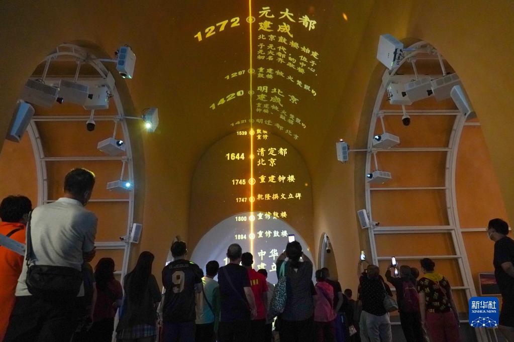 2022年8月28日,觀眾在北京鼓樓一層觀看“時間的故事”展覽中的光影秀。2019年11月,北京啟動鼓樓保護展示工程,經過騰退修繕,這里恢復了券洞歷史風貌,成為向公眾開放、展示鐘鼓樓歷史文化的文化空間。 新華社記者 陳鐘昊 攝