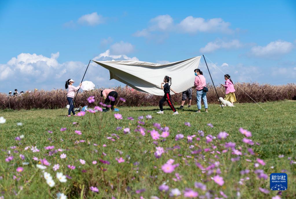 10月5日,市民在云南昆明寶豐半島濕地公園搭帳篷。