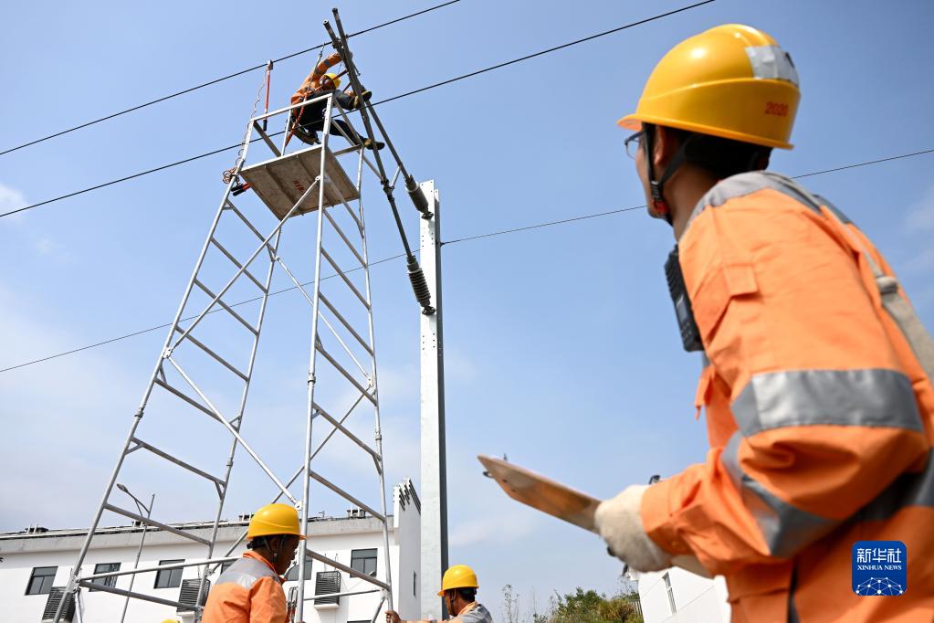 10月4日,在位于安徽黃山的杭昌高速鐵路黃山北存車場,接觸網(wǎng)工在檢修接觸網(wǎng)設備。