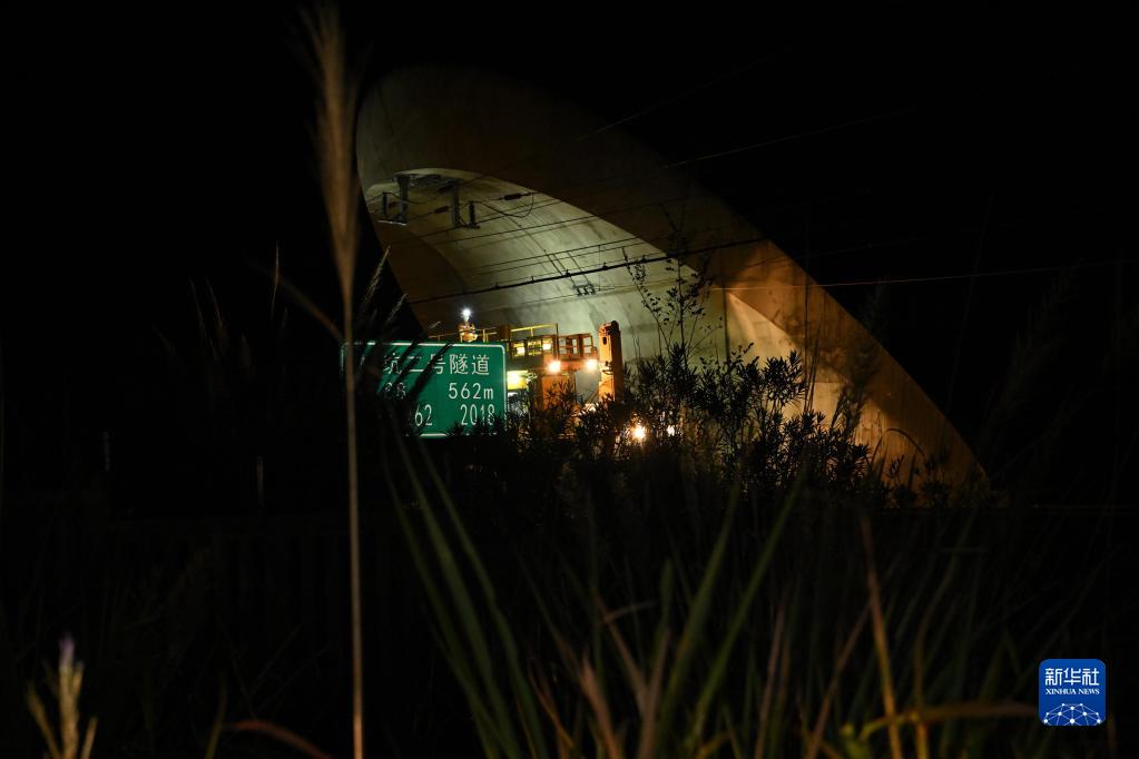 10月5日凌晨,在安徽宣城杭黃高鐵績溪段,接觸網工在檢修接觸網設備。