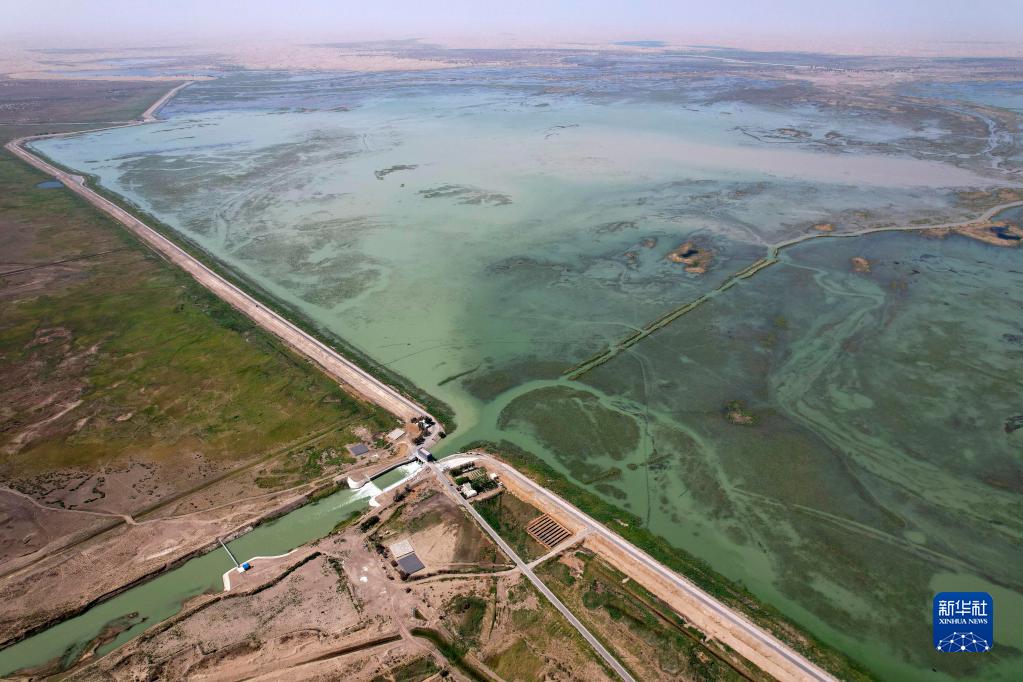 這是2022年8月20日拍攝的新疆尉犁縣境內(nèi)大西海子水庫(kù)以及泄洪閘(無人機(jī)照片)。