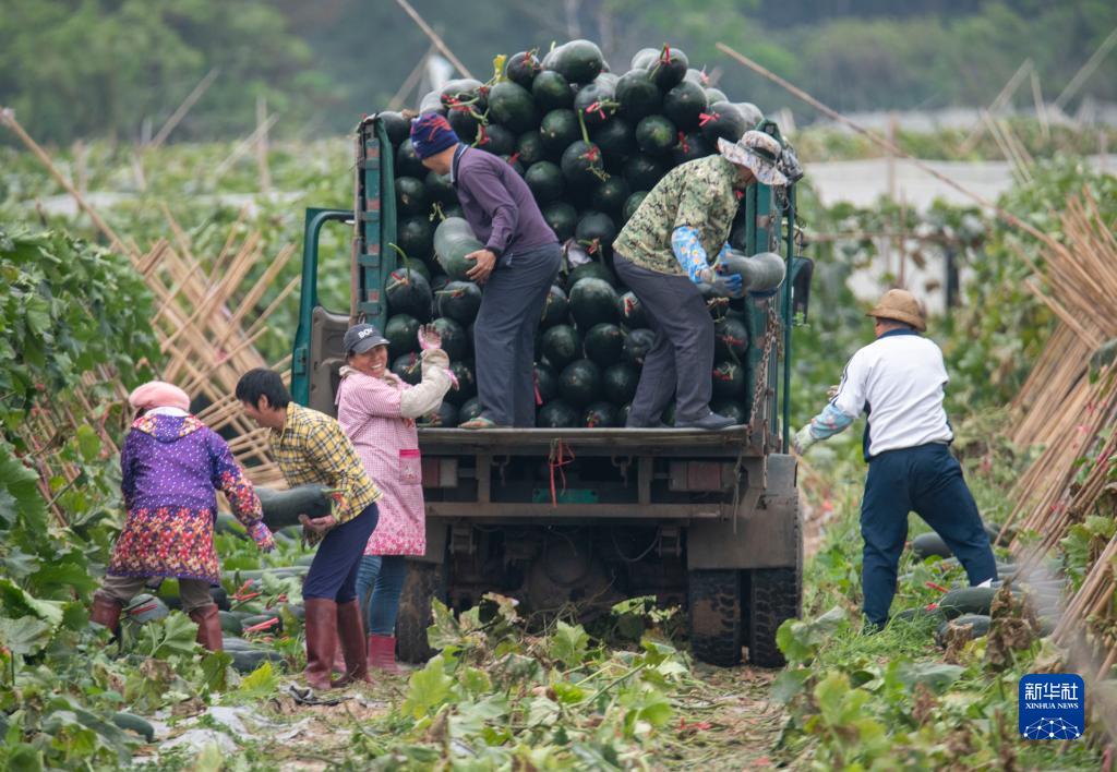 海南省瓊海市潭門鎮福田村的農民在裝運收獲的冬瓜(2022年2月24日攝)。