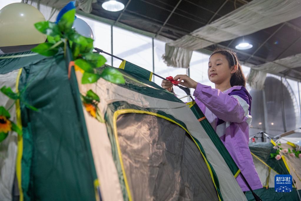 10月5日,在天華百卉園內(nèi),小朋友在布置帳篷。