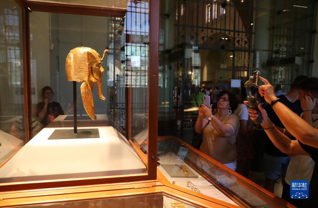 10月5日,在位于埃及開羅的埃及博物館,游客拍攝法老蘇瑟奈斯一世的金面具。 新華社記者 隋先凱 攝