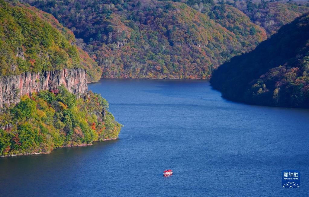 10月5日,游船行駛在吉林紅石國家森林公園內的白山湖上。