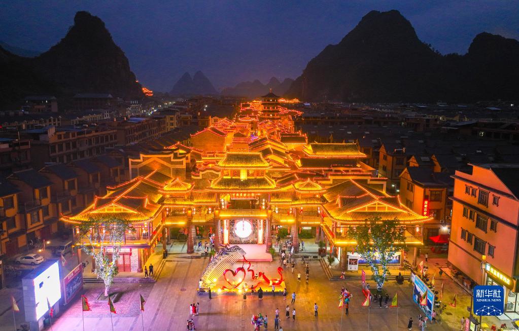 10月5日拍攝的湖南省永州市江華瑤族自治縣水口鎮瑤都水街夜景(無人機照片)。