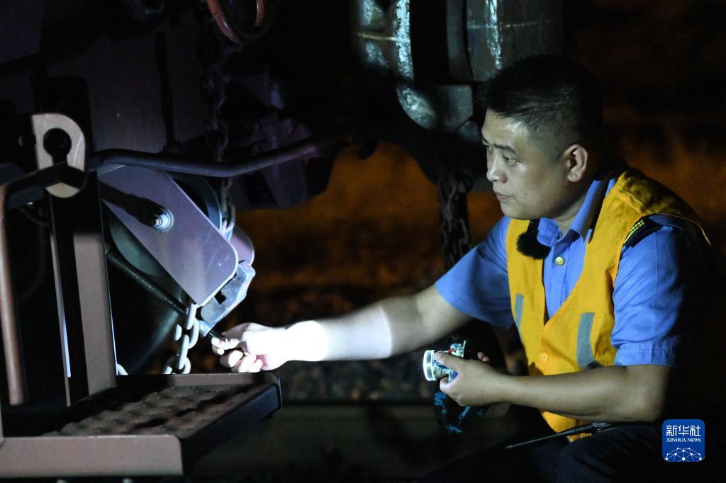 在百色車務段清水河西站,張天鹍在檢查列車防溜人力制動機緊固器(10月4日攝)。