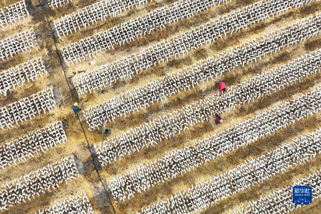 10月6日,村民在貴州省黔東南苗族侗族自治州岑鞏縣水尾鎮新場村黑木耳基地勞作(無人機照片)。