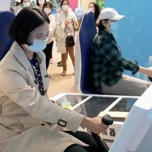 10月7日,觀眾在“奮進新時代”主題成就展上體驗操縱直升機訓練模擬器。