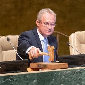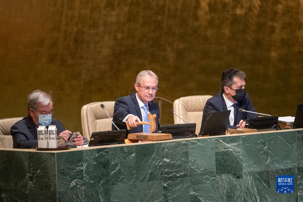10月7日,在位于紐約的聯合國總部,第77屆聯大主席克勒希(中)參加就巴基斯坦洪災舉行的聯合國大會全體會議。