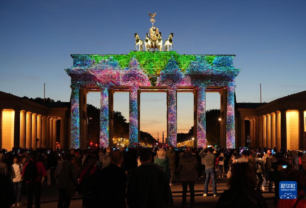 10月7日,德國(guó)柏林勃蘭登堡門被燈光點(diǎn)亮。柏林燈光節(jié)于10月7日至16日舉行。燈光節(jié)期間,柏林市內(nèi)多個(gè)地標(biāo)和建筑物將被燈光和裝置藝術(shù)品裝飾。新華社發(fā)(斯特凡·蔡茨攝)