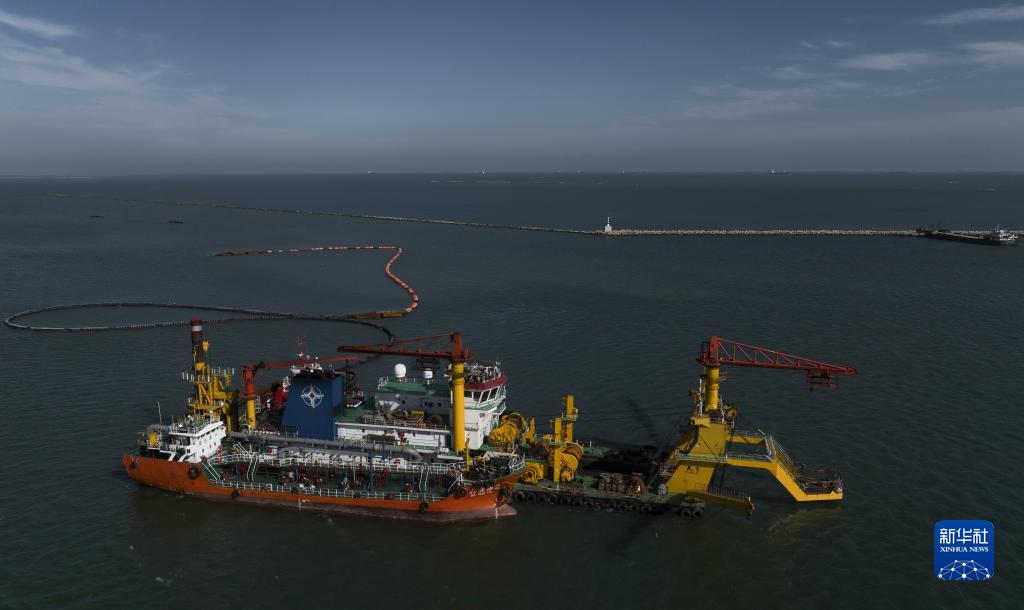 10月8日,施工船在唐山港京唐港區第四港池25萬噸級航道工程建設工地施工(無人機照片)。新華社記者 楊世堯 攝