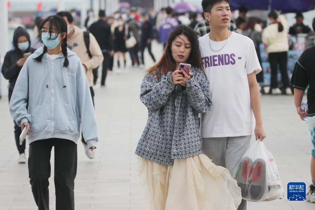 10月8日,游客在山東青島棧橋風景區(qū)游玩。