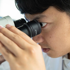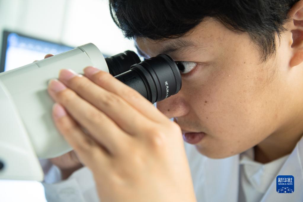 10月6日,“95后”的澳門科技大學(xué)月球與行星科學(xué)國家重點(diǎn)實(shí)驗(yàn)室博士生劉子博使用光學(xué)顯微鏡觀察月球隕石薄片的顯微特征。新華社記者 張金加 攝