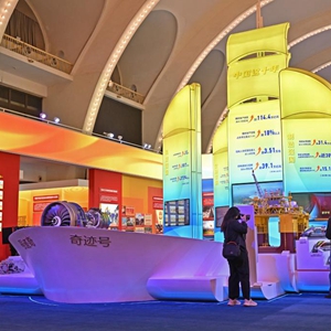 10月8日,一名觀眾在中央綜合展區內參觀拍攝中國經濟“奇跡”號巨輪模型。新華社記者 李鑫 攝