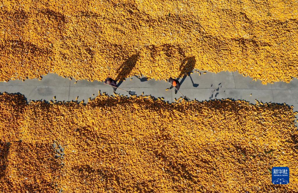 10月9日,在河北省石家莊晉州市周家莊鄉(xiāng)第七生產(chǎn)隊,農(nóng)民在晾曬收獲的玉米(無人機(jī)照片)。