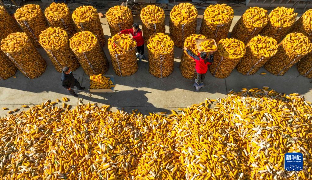 10月9日,河北省遵化市劉備寨鄉農民將收獲的玉米裝入糧囤(無人機照片)。