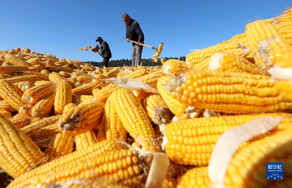 10月9日,在河北省石家莊晉州市周家莊鄉(xiāng)第七生產(chǎn)隊(duì),農(nóng)民在晾曬收獲的玉米。