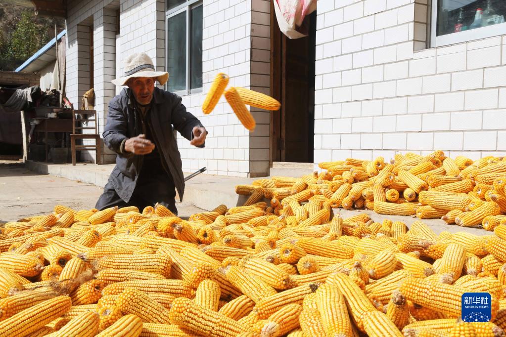 10月9日,甘肅省定西市安定區(qū)青嵐山鄉(xiāng)大坪村農(nóng)民在晾曬玉米。
