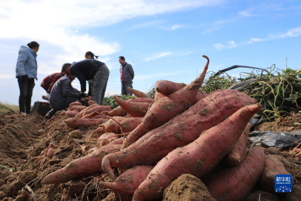 10月9日,河南省焦作市溫縣黃河街道張王莊村農民在收獲紅薯。