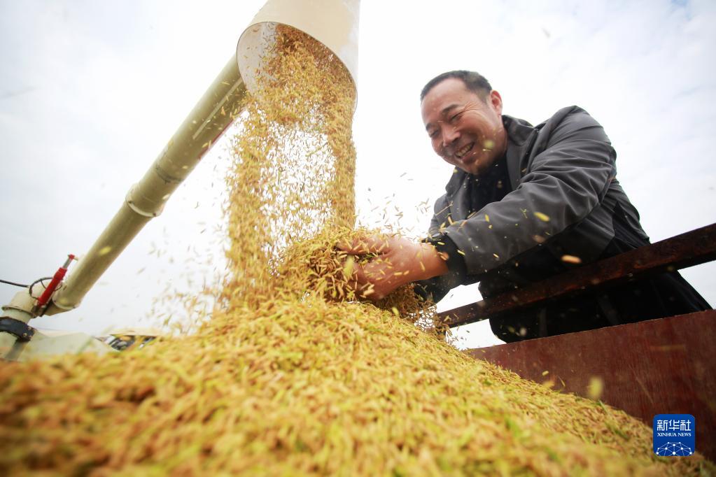 10月9日,在江蘇省儀征市陳集鎮(zhèn)友好村,農(nóng)民在收獲水稻。