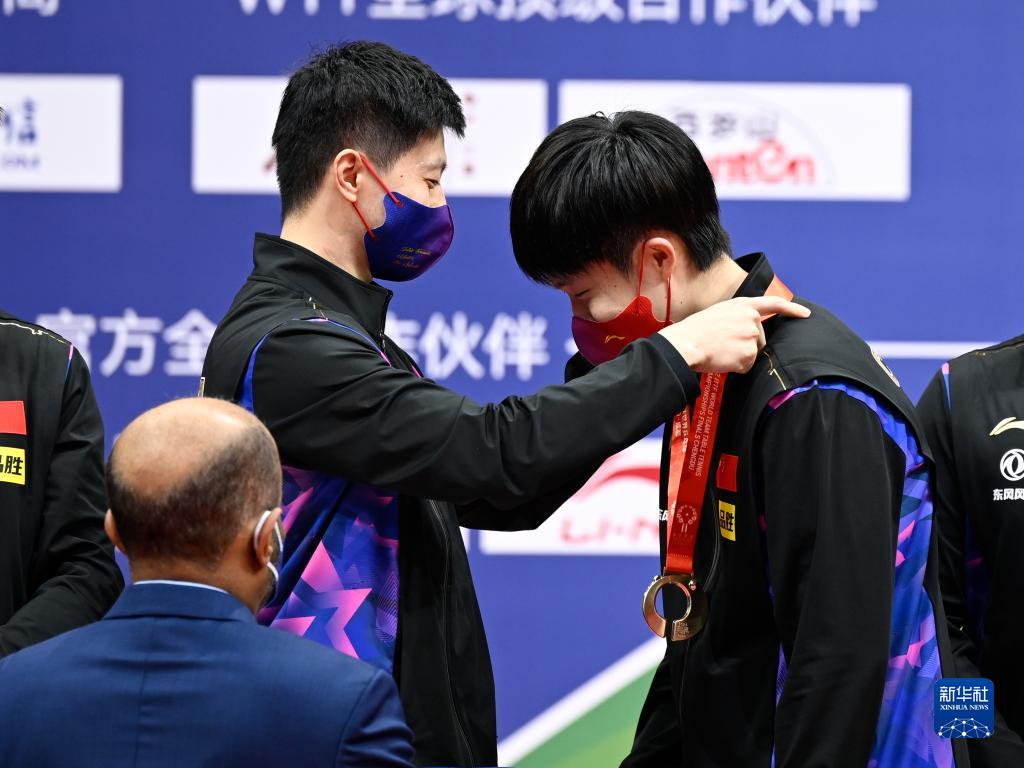 10月9日,中國隊選手馬龍(左)在頒獎儀式上為隊友王楚欽佩戴金牌。新華社記者 胥冰潔 攝