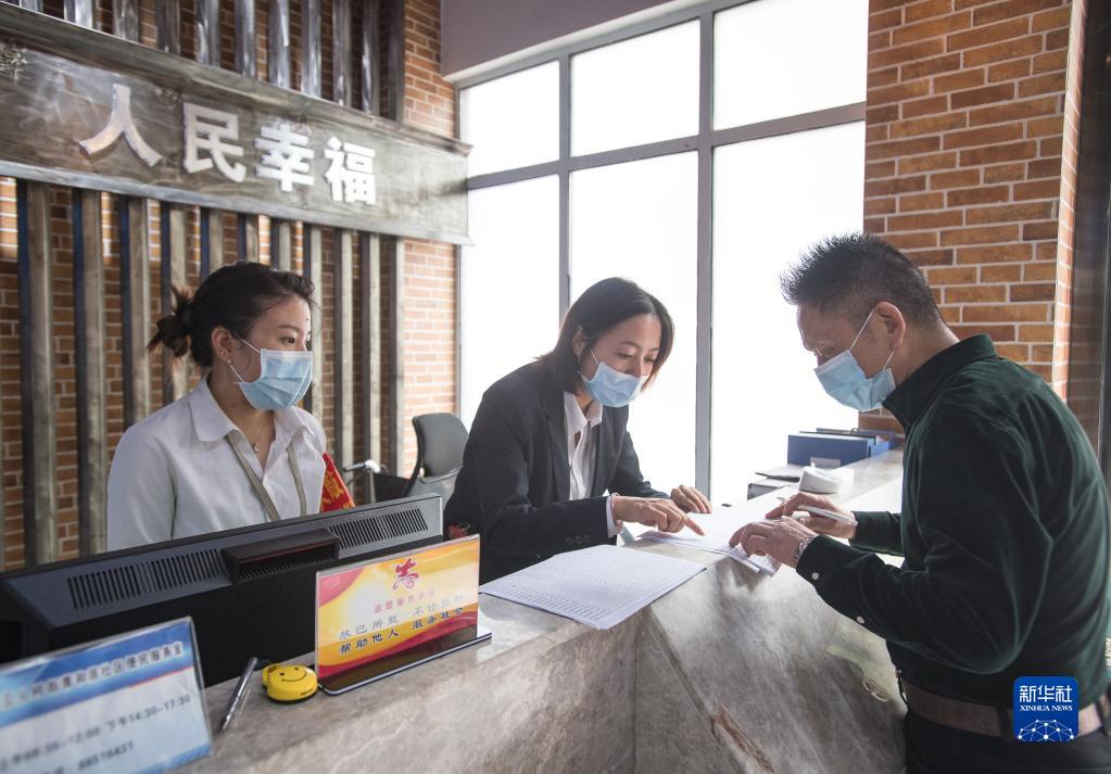 2020年9月18日,湖北省武漢市青和居社區服務中心工作人員協助社區居民填寫材料。新華社記者 肖藝九 攝
