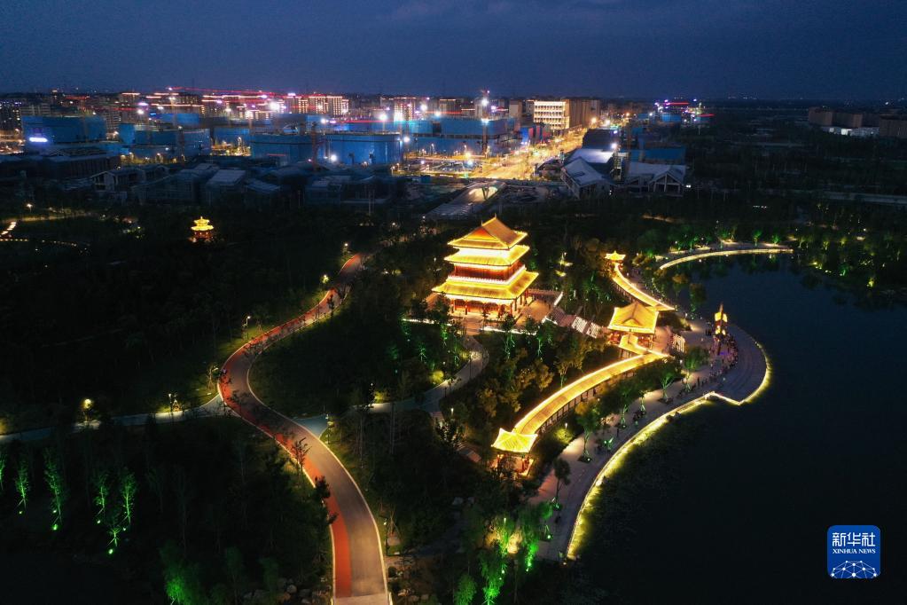 2022年7月28日拍攝的雄安新區(qū)容東片區(qū)金湖公園夜景(無人機(jī)照片)。