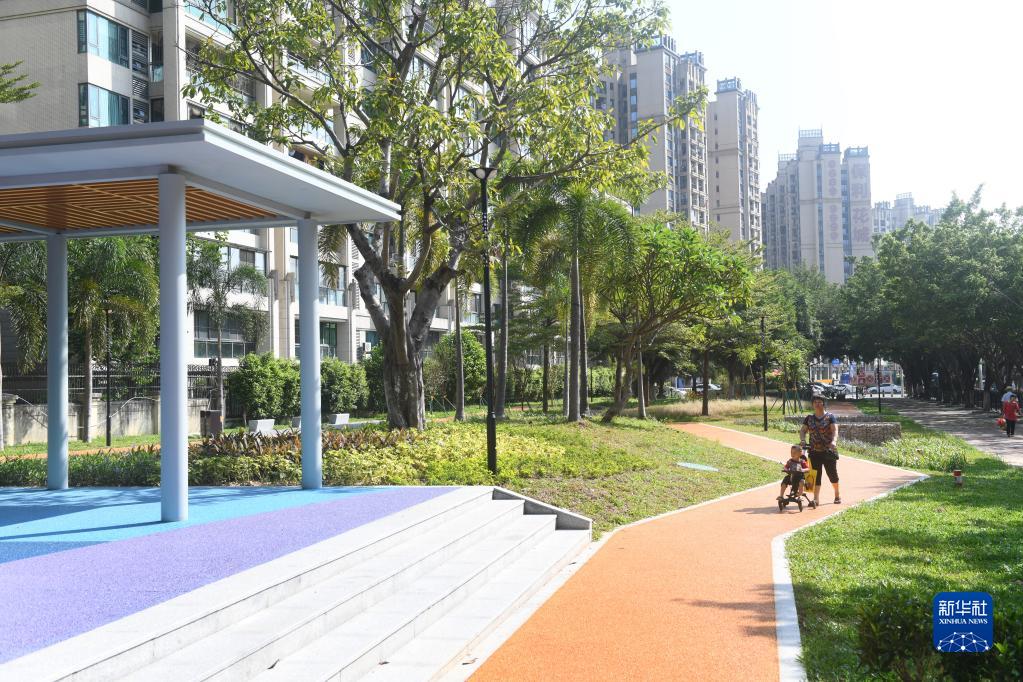 10月10日,市民在位于廣州市花都區的紫蘭口袋公園里散步。