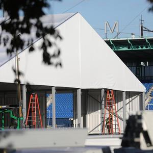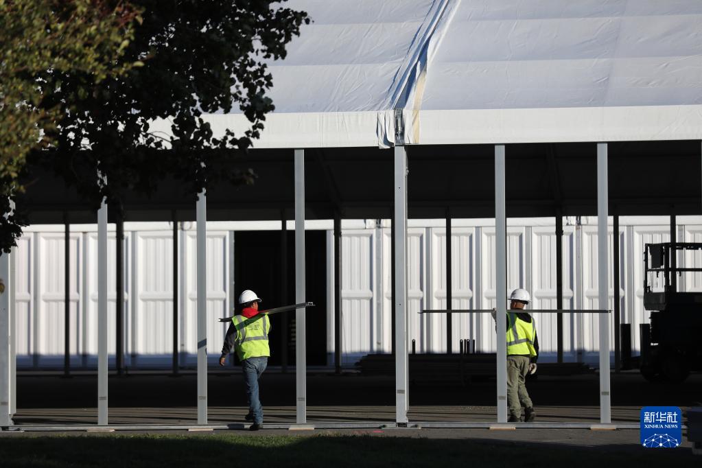 10月9日,工人在位于美國紐約市蘭德爾島的移民救援中心建設工地工作。