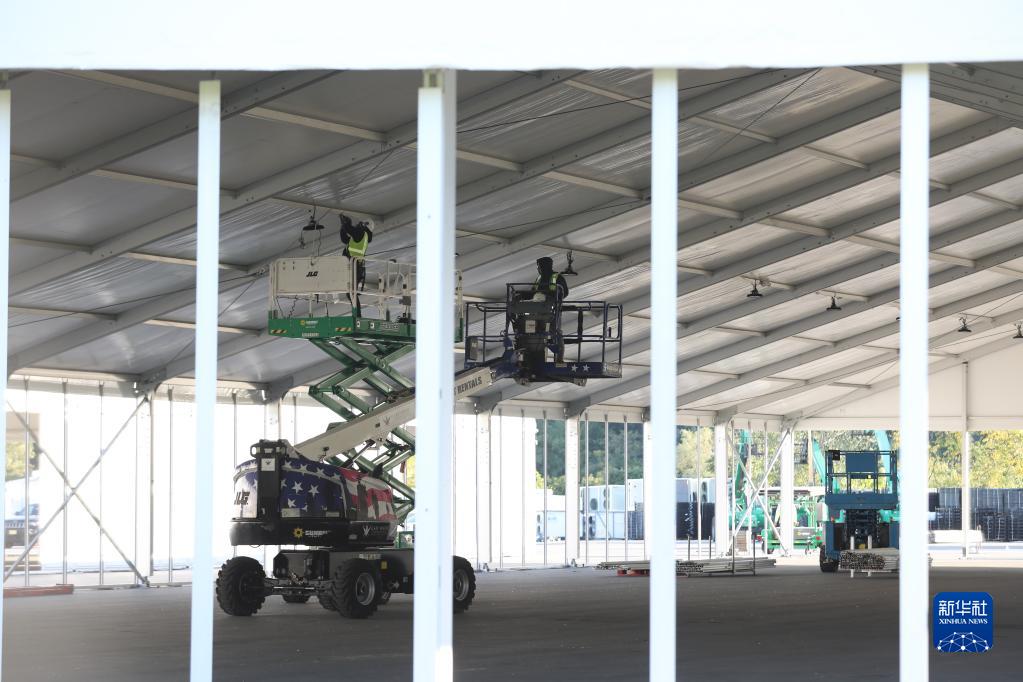 10月9日,工人在位于美國紐約市蘭德爾島的移民救援中心建設工地工作。