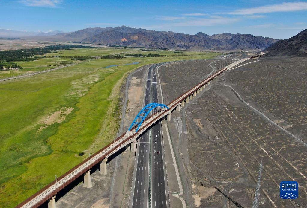 連(云港)霍(爾果斯)高速公路新疆小草湖至烏魯木齊段從蘭新鐵路下方穿過(2020年7月1日攝,無人機照片)。