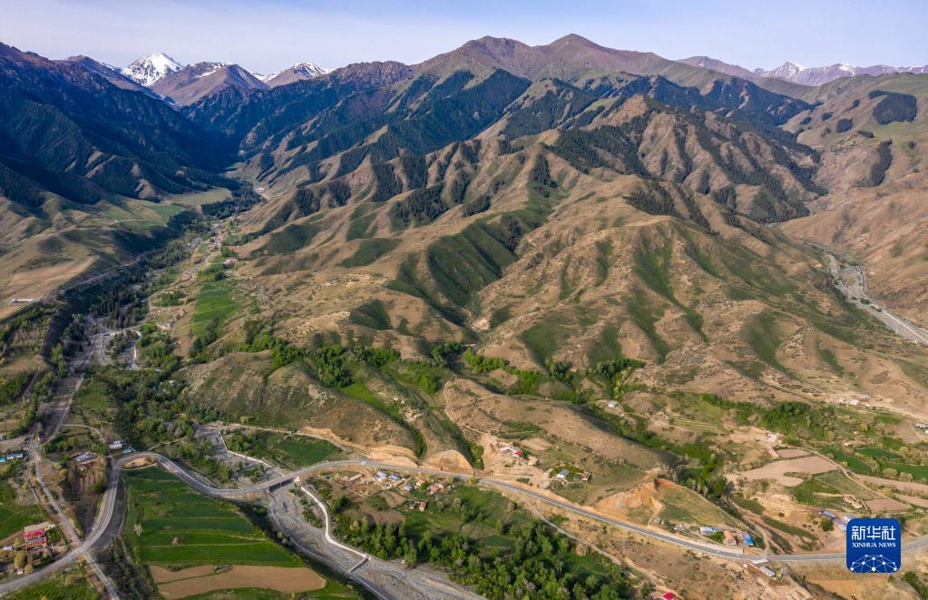 新疆吉木薩爾縣新地鄉(xiāng)的一處伴山鄉(xiāng)間公路(2022年5月22日攝,無人機照片)。路旁的小分子村發(fā)展鄉(xiāng)村旅游,成為遠近聞名的“畫家村”。