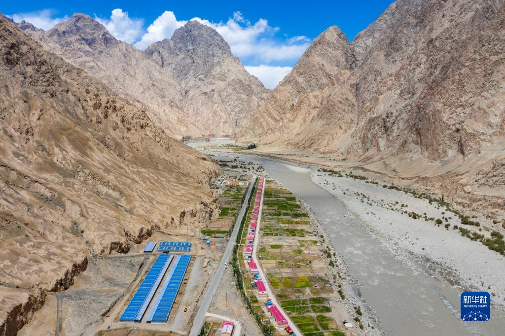 通往縣城的公路從新疆塔什庫爾干塔吉克自治縣大同鄉的一處易地扶貧搬遷安置點旁穿過(2020年6月14日攝,無人機照片)。